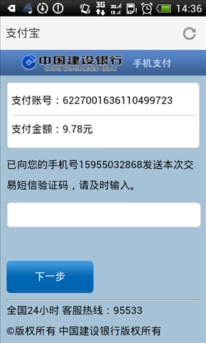 1.您通过手机在商户网站进行支付,选择建行手机支付,系统会自动跳转至我行的手机银行支付页面,您可以点击“手机银行支付”。